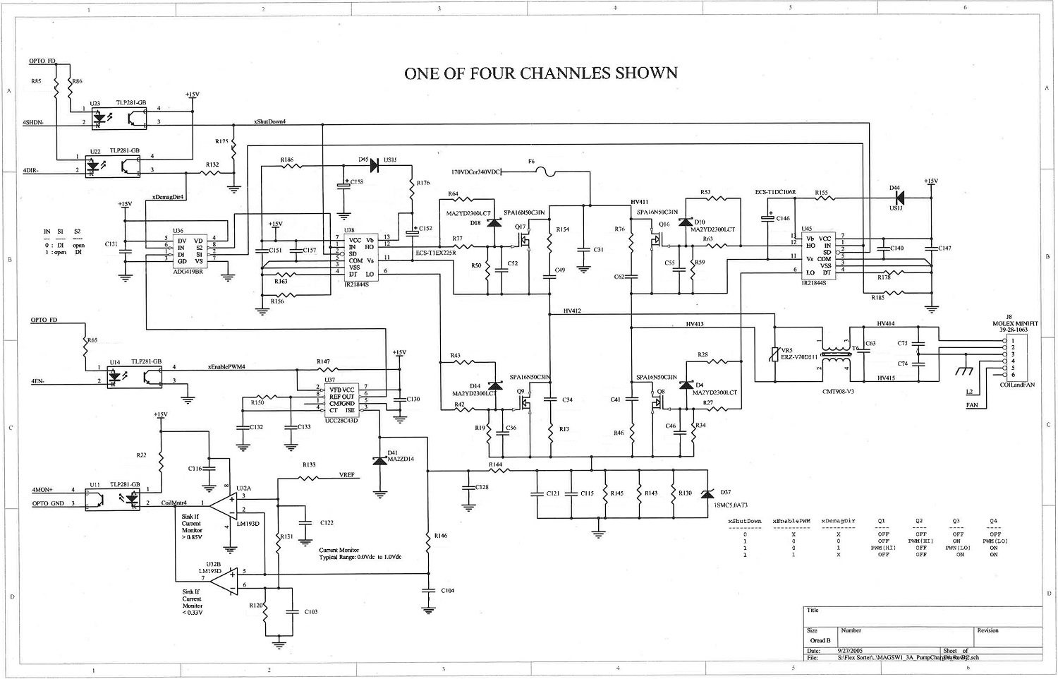 This circuit drives magnets that divert shoes on a conveyor belt to sort packages to different lanes. My job was to do validation testing in worst case situations and make improvements so that it would comply with agencies such as UL and FCC. The validation test procedure is documented here. Initially we had trouble with radiated and conducted transmission. So we included resistors, capacitors, and diodes in the gate circuit of the power transistors and included snubber circuits across the Drain and Source of each transistor.