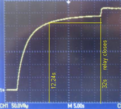 Why is there a further charge at the end of 32 seconds in Trace 1? For the first 32 seconds the relay is in its normally closed position so that the charging voltage is divided between PTC1 and the series combination of R1, the DB1 diode resistance, and the resistance of the transformer secondary windings that’s between the power line and the board. After the 32 seconds, the relay opens, and PTC1 is no longer in the circuit so that the line voltage is no longer divided and the full line voltage can charge the caps.