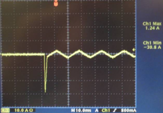 It is believed that the small, damped oscillations labeled “A” and “B” on the left are associated with is the phase and gain of the feedback loop of the switch mode power supply. It can be seen that this oscillation is well under control and there is no need to worry about fast load changes sending the output into sustained oscillations.