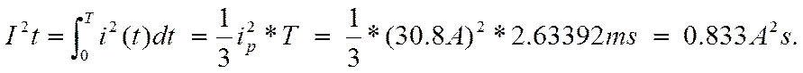 Notice there can be as much as a 30.8A initial charge current. This 30A spike is not due to charging the large caps since that is limited by R88 to under 1A. The large spike is due to the charging of C5 through D1 and the charging of C6 through D2. This is the largest peak of a spike that I could capture within 15 attempts. It lasts for 2.63392ms. And it represents a pulse with an I2t rating of: