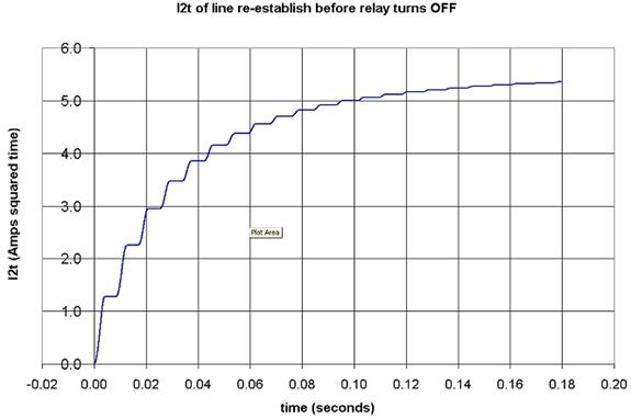 To calculate the I2t current in this pulse, CSV file was captured using the TDS 3052 oscilloscope and brought into Excel where the numerical integration was performed. See this Excel File. The result is shown in Graph_1 below. As can be seen, the graph approaches about 5.5A2s. F2, F3, DB1, and R1 all need to be able to handle this amount of surge. I’ve activated this pulse in the circuit about 10 time with no problem with these components.