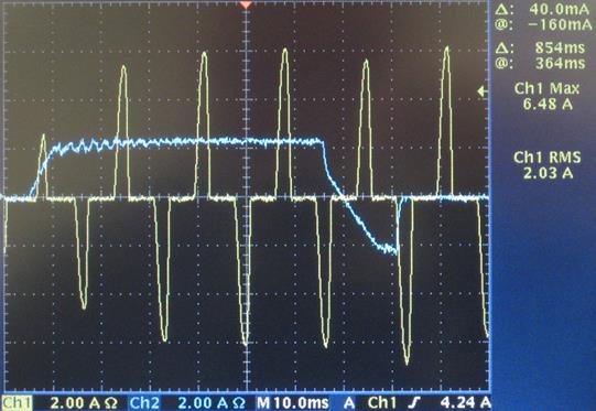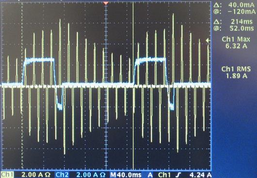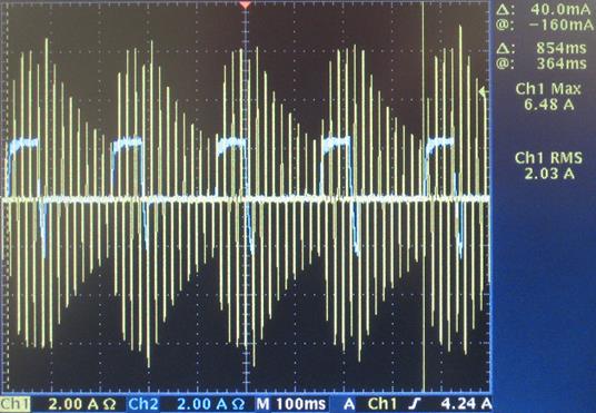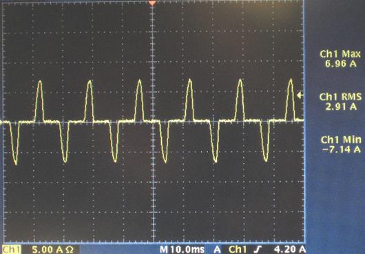 Trace 2 below shows the AC line current going into the Power Board. It shows that a positive peak of 3.96A is captured and a negative peak of -4.48A.