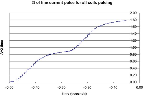It should be noted that if the coils are running at the time the power is engaged after Vhigh has discharged to 180Vdc, then the coil current will have to be added to the capacitor charge current. This is an unlikely scenario but still possible.