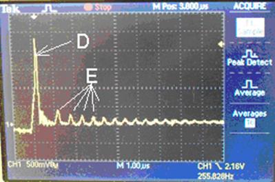 Notice that the first waveform on the left is on the scale of 1.00ms/div, and the waveform on the right is on the scale of 1.00us/div. Both have a vertical scale of 500mV/div. The waveform on the right show a time magnified version of the spike “C” on the left.