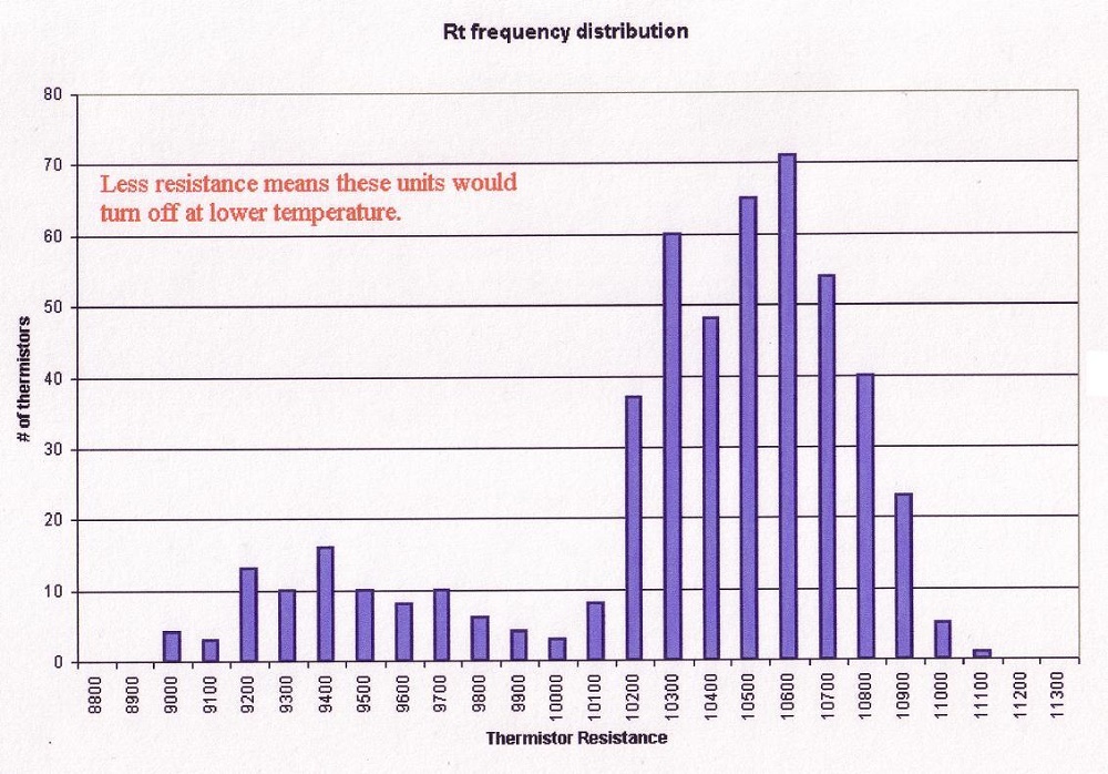 There was also an issue with the thermistor that measured the water temperature. This thermistor was epoxied into an indentation in the steal tube. It was used as part of a safety switch to turn the heating element off if the water got too hot. Production reported that some units would turn off at too low of a temperature. So I measured many samples at the same room temperature and formed a histogram (See the graph below). I found that our supplier of thermistors was including thermistors of a lower value in the bags they were selling to us. I showed them the histogram and asked them to better sort the products they were selling to us.