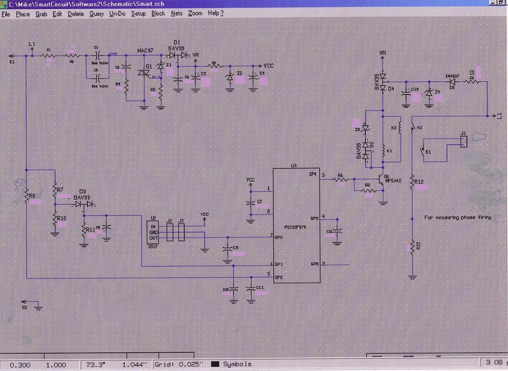 This is a software controlled safety shut-off circuit for a heating element of a water heater. Current through the heating element increases with temperature. The circuit monitors the current with a Hall-effect in the air gap of a torroidal Ferrite core. If the current changes too fast or becomes too large, the device opens the circuit to the heating element. I was solely responsible for this project from design to prototyping.